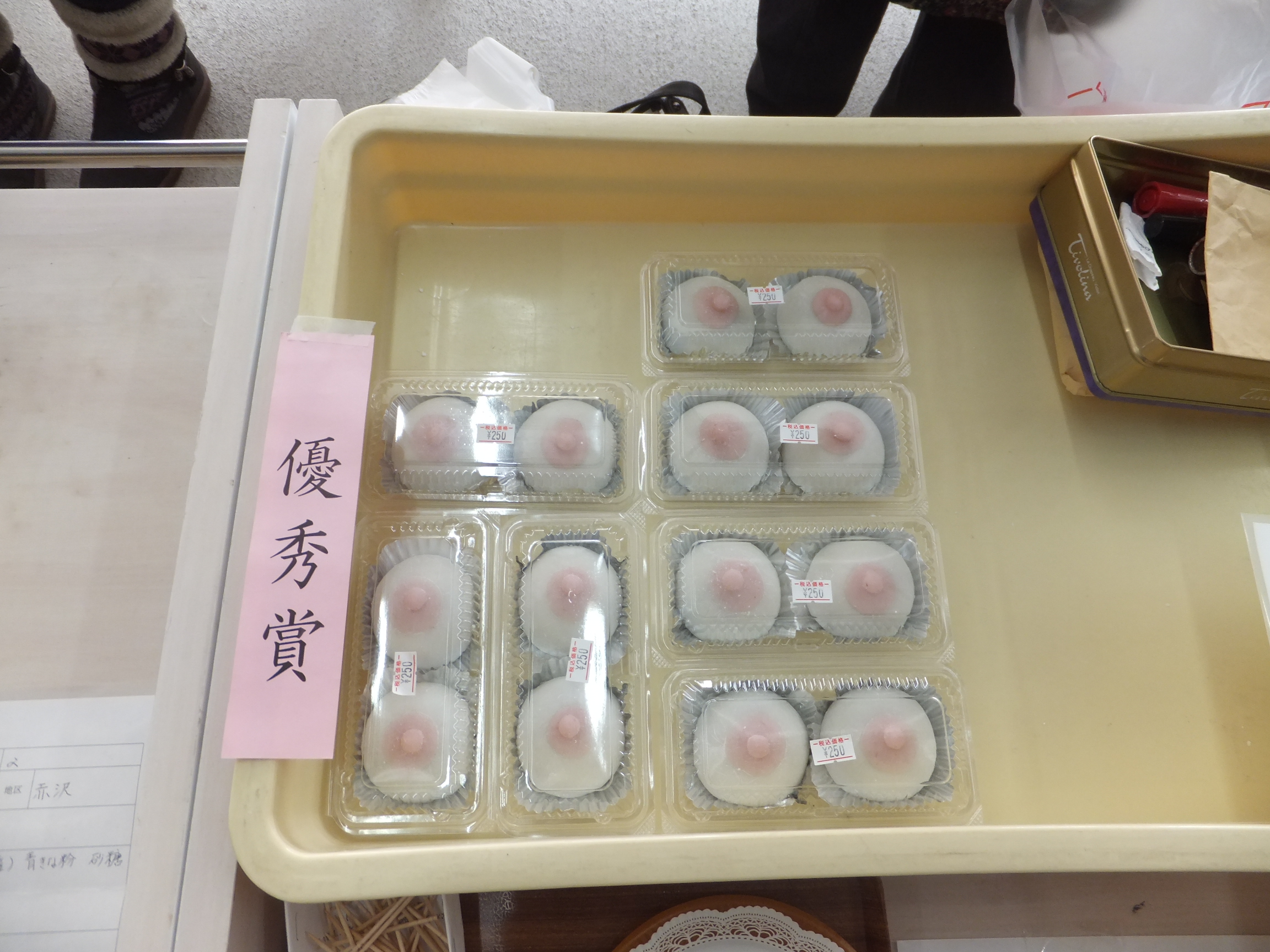 地元に祀られている乳神様に肖って造ったまんじゅう。おっぱいの形をし中に小豆餡、またその中にサツマイモが入っている。乳首には梅肉を使い色を出し、ほどよい酸味があり、味わいがある。